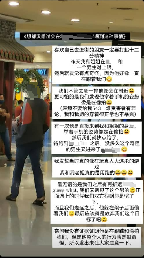 这名不愿具名的女子向星洲日报指出,她昨天与姐姐到一家购物广场逛街时,突然与一名男子对上眼,随后发现男子似乎一直在跟随他们。