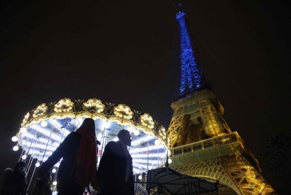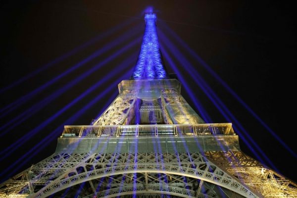巴黎铁塔亮起蓝黄灯光支持乌克兰