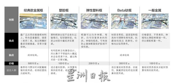 镜框通常有金属、塑料和混合材料等几种材质可供选择,而镜框的强度、性能、价格也会随着不同材质的使用而变化。
