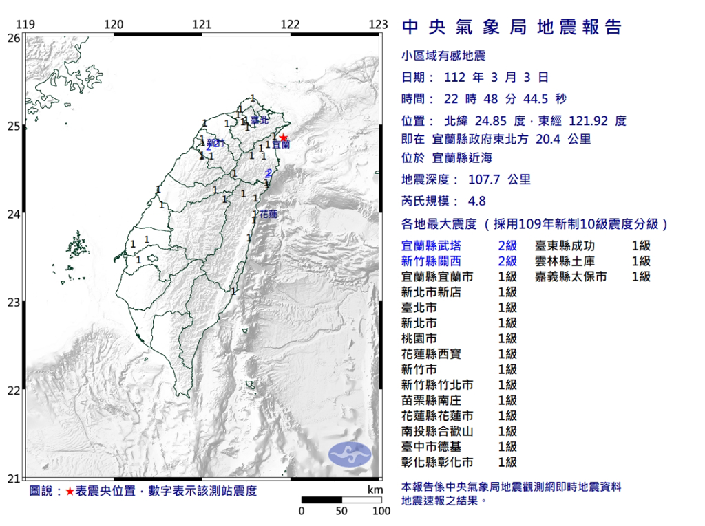 宜兰县近海3日晚上10时48分发生4.8级地震,深度107.7公里,震央位在宜兰县政府东北方20.4公里,最大震度2级在宜兰,北台湾普遍能感受到轻微摇晃。