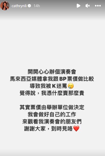 在新闻曝光后,Blink和网民都在社媒上留言,调侃李元玲的演奏会票价“好贵”等,更因此引出本尊亲自回应:票价是主办方决定的。