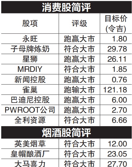 今年消费股预计仍获季节性高客流量、M40群体的强劲购买力、店面扩展和翻新,以及国际游客回归的带动。然而,餐饮业务利润仍受高营运成本和薪资的影响。在没有严重的供应链中断情况下,巴迪尼控股、MRDIY(MRDIY,5296,主板消费产品服务组)、星狮(F&N,3689,主板消费产品服务组)和全利资源的良好产品组合和营运效率可为公司带来防御性利润。