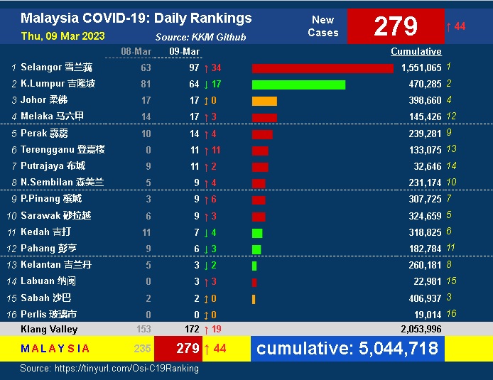 (八打灵再也9日讯)我国今日新增279宗冠病确诊病例,较昨日增加44宗,累计病例达到504万4718宗。