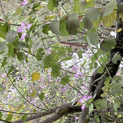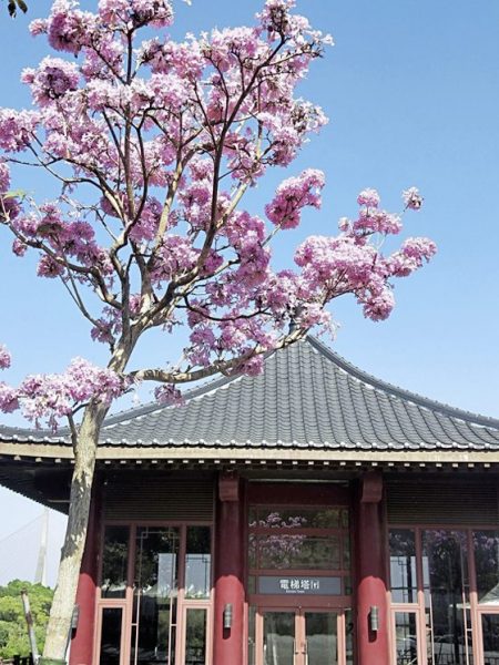 电视塔前的紫花风铃木争相怒放,迎风展出一片浪漫的紫色。