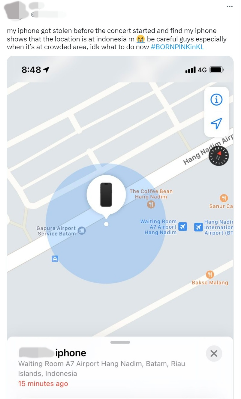 女子“@user94osh”在推特发文,指早前出席韩国女子天团Blackpink在吉隆坡武吉加里尔国家体育场的演唱会,并不幸在开场前遗失了自己的苹果手机(iPhone)。