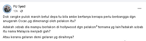 他较后再发布一则贴文指出:“没想到,我说那个演员拿奥斯卡奖有什么值得骄傲的,让这么多人生气。