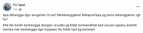 他们在PU Syed脸书和Instagaram贴文留言:“我为杨紫琼感到骄傲,你不觉得骄傲,那是你的问题”、“我们只是跟她说声恭喜,又没有游行”、“你可以消停一会吗?只会让不同宗教的人更加厌恶。”