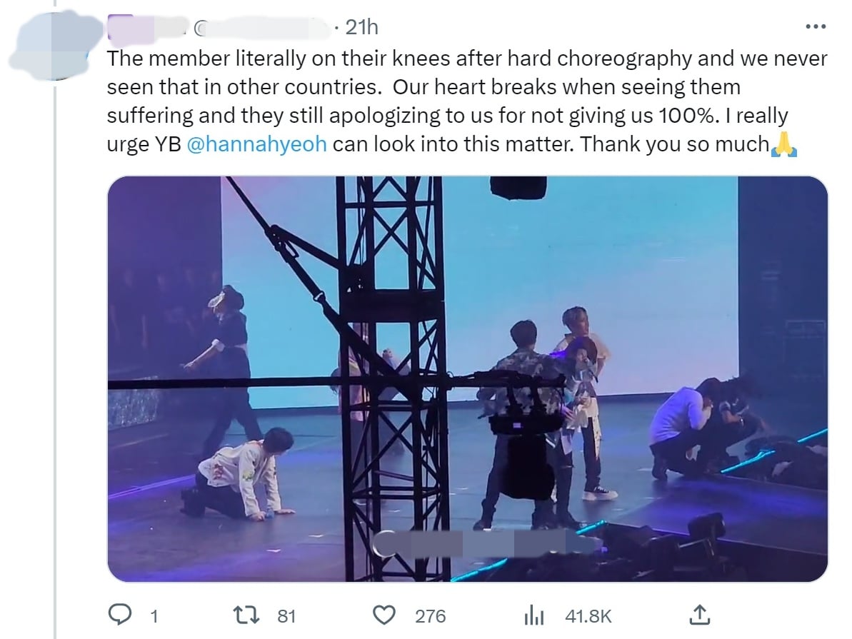 他表示,当天体育馆内非常闷热,不仅台下观众觉得热,就连成员在完成舞蹈后,相续跪坐在台上,看起来快要窒息。
