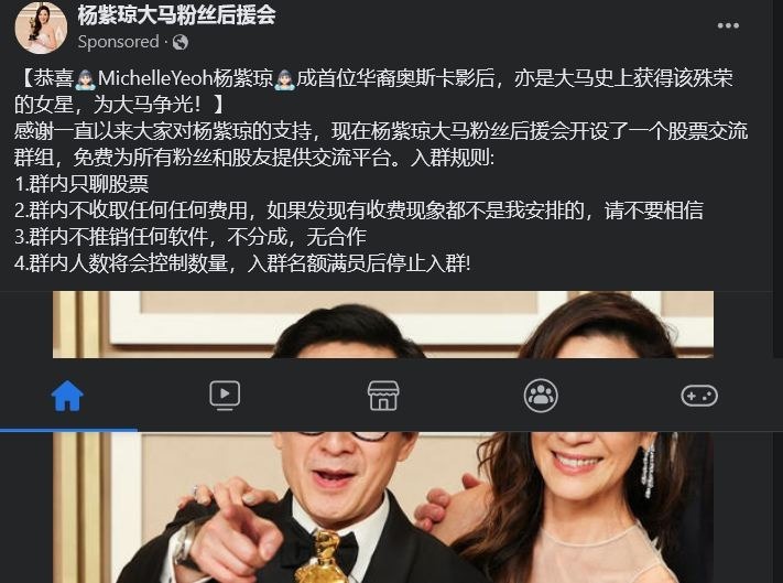 本报今日在脸书发现一则以“杨紫琼大马粉丝后会”为名投放的广告,盗用杨紫琼获奖的照片恭喜她获奖之余,还指为感谢杨紫琼的支持者,该后援会将开设一个股票交流群,免费为粉丝和股友提供交流平台。