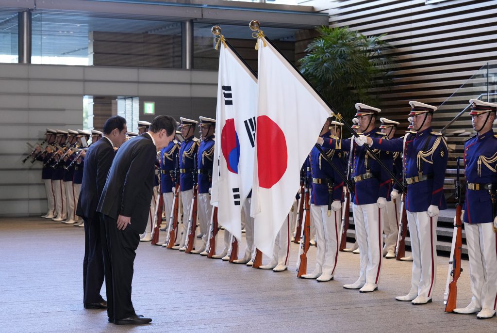 尹锡悦周四访日会见日本首相岸田文雄,在欢迎仪式上出现争议一幕。尹锡悦先是把手放胸前向韩国国旗行礼,之后又同岸田一起向两国国旗鞠躬。不过,从日媒转播的画面角度来看,由于韩国国旗被日本国旗挡住,看起来就像是尹锡悦在向日本国旗鞠躬。