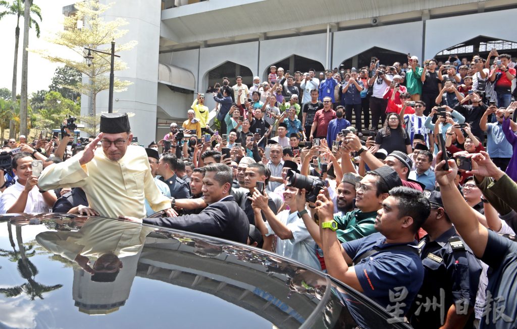 安华在祈祷结束后离开现场前,站在车门旁与学生和民众挥手道别。
