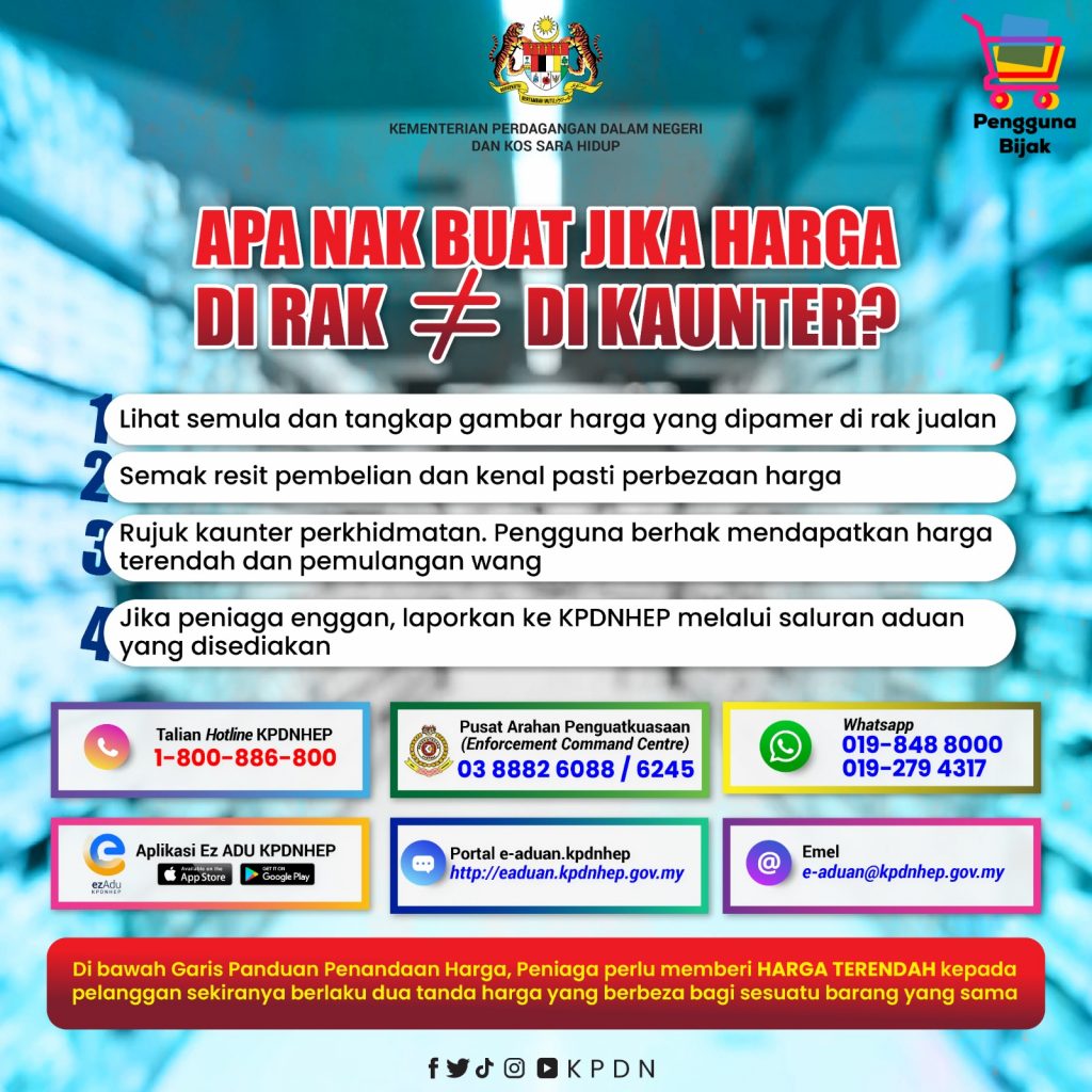 对此,内贸部也在推文下发图指出,公众若遇到货架上的标价与结账时的价格不一样,公众可以先回去查看货架标价,并且拍下照片,若结账后也可以透过收据检查货品价格。