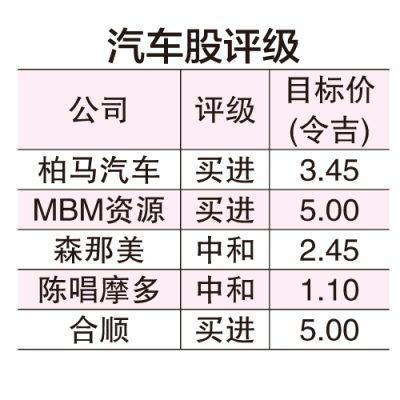 该行首选汽车股为合顺和柏马汽车。其中,合顺旗下第二国产车在2023年的销售料强劲,同时其航天业务将转盈。至于柏马汽车旗下3大汽车品牌料保持成长,动力来自本地装配的马自达CX-30,以及起亚(Kia)和标致(Peugeot)继续推出新车款。