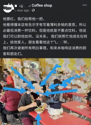 咖啡店业者把一名只点面食,没有点饮料的年长男子照片上载到脸书“声讨”,指称要让他红,没料到网民的评论几乎一面倒声援老人家,抨击店家不尊重别人隐私的做法。