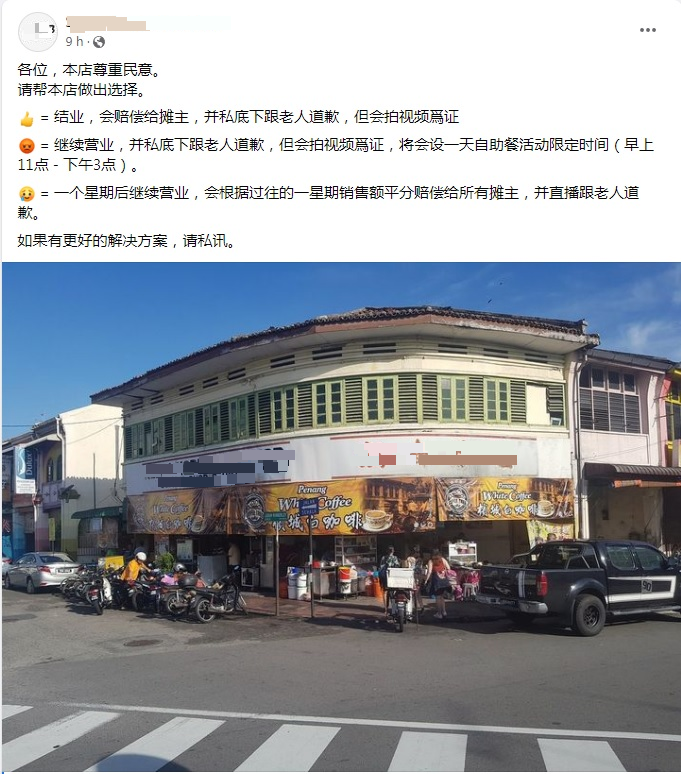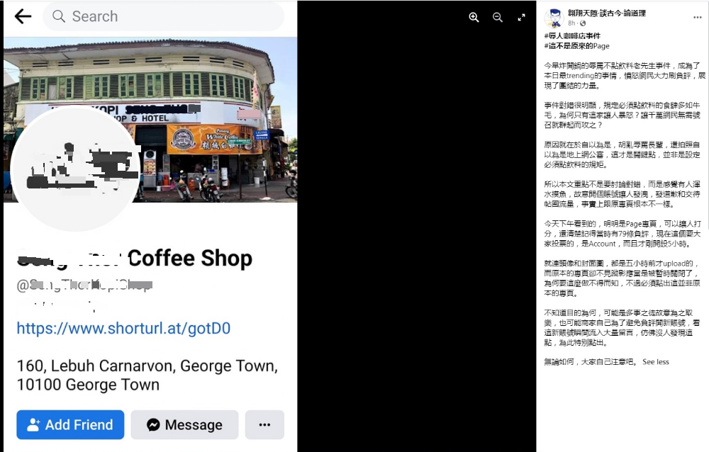 (槟城21日讯)乔治市一家咖啡店因不满年长男子用餐拒点饮料,而在脸书公开长者照片反遭网名炮轰后,目前已关闭脸书专页;无论如何,社交媒体较后也出现一个疑似冒名有关咖啡店的脸书账户,并提出3方案要求“民意”协助做出选择。