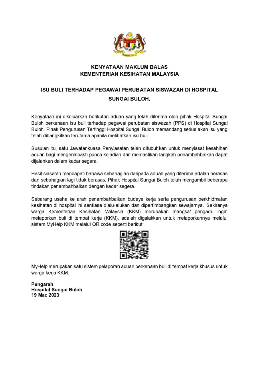 声明也促请受害人或投诉人,可以二维码通过卫生部的“MyHelp”系统针对工作场所欺凌行为进行举报。