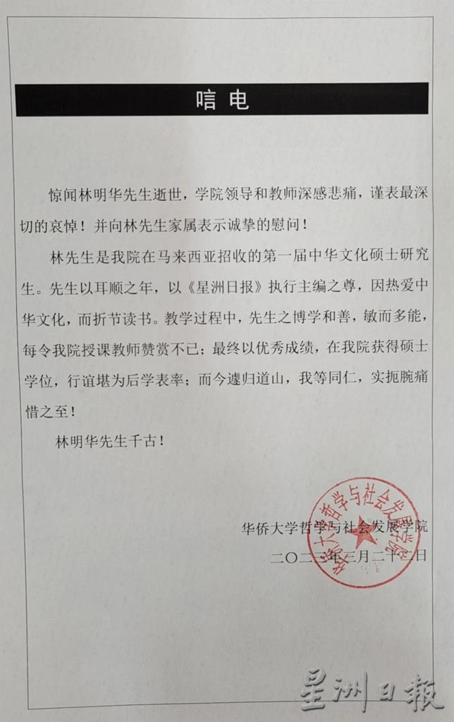 中国华侨大学哲学与社会发展学院多名教授,联合发了一封唁电,哀悼在该校修读境外硕士课程的学生林明华。