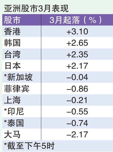 亚洲股市在3月起落参半,表现最亮眼的是香港股市,恒生指数 共飙升3.10%;马股表现最差,跌2.17%。