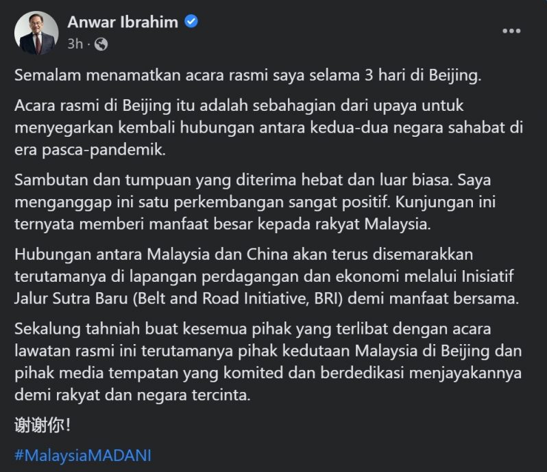 他在脸书发文指出,自己刚结束了到中国北京展开的3天工作访问,而此行程是为了重振大马与中国在后疫情时期的友好关系。