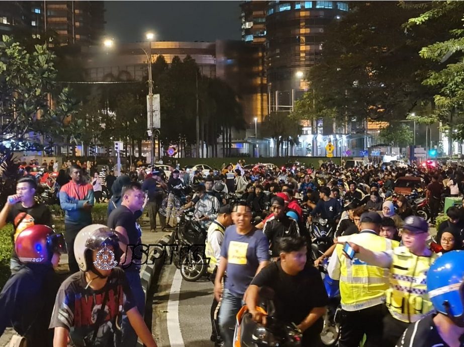 “警方接获民众投诉指,在KLCC一带每逢周末便有上百青少年聚集喧闹,警方因此于昨晚出动85名警官和警员前往该地展开行动,当场检查了约500辆摩托车。”