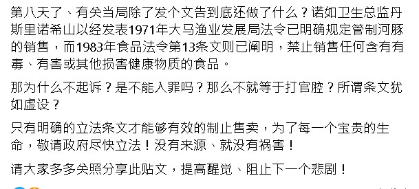 “有人透露在某巴刹能轻易买到鸡腿鱼,这真的太可怕了,简直如同在卖毒药,草菅人命。”
