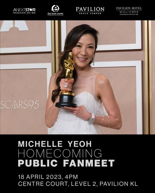 (吉隆坡4日讯)丹斯里杨紫琼凭《瞬息全宇宙》(Everything Everywhere All At Once )缔造历史,成为奥斯卡史上首位华裔影后,当时她在会上表示要把奖座带回大马,与家人分享喜悦,並将于4月18日下午4时现身吉隆坡柏威年广场,出席《Pride of Malaysia Michelle Yeoh Homecoming Public Fan Meet》,在粉丝见面会上和大马影迷见面。