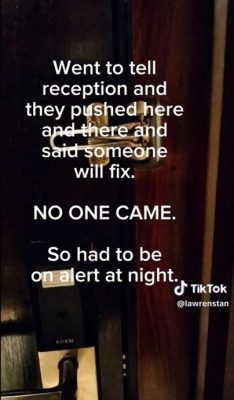他说,这是非常严重的问题,因此立即向酒店前台求助,但最终却没有人来修理房门,而且工作人员还通知酒店房间已经订满,无法为他们更换房间。