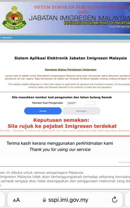 截至今天下午3时为止,在马来西亚移民局官网的行动查阅系统输入李金友的身分证号码,结果是被要求前往邻近的移民局。