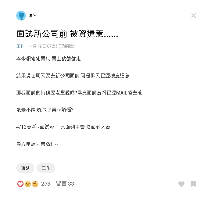 这名网友在Dcard上,以“面试新公司前被资遣惹(了)”为题发文,提到他趁着在职期间面试,心想着偷偷找新工作,如果应征上了就默默离职,不料才正准备去新公司面试,他就先被现职公司给资遣了。