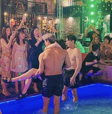 从不少视频中可以看到,男模服务员自愿抱起女性遊客,和女性遊客在泳池中互动,并让遊客的朋友拍照留念,拍完后就把顾客送回岸上,这样的行为让顾客很是开心,给的小费自然也不会少。