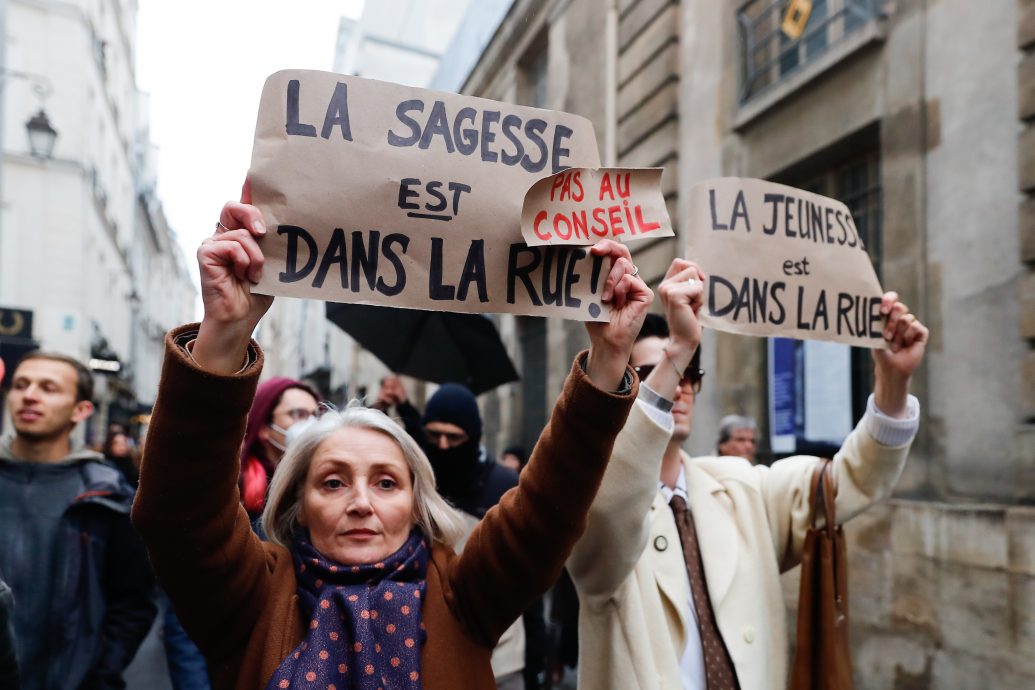 马克龙政府禁止在巴黎宪法委员会大楼前举行示威活动,直至周六上午,不过反对阵营依旧在附近聚集抗议,高呼将继续抗争,直到法案被撤销。