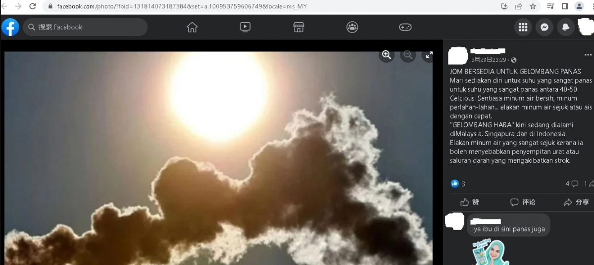 (八打灵再也15日讯)我国天气近日变得酷热无比,各种与气候相关的传言也随之而现。马来文社区流传一则声称东南亚周边国家正迎来热浪的到来,而大口喝冷饮的习惯将导致血管爆裂的信息。