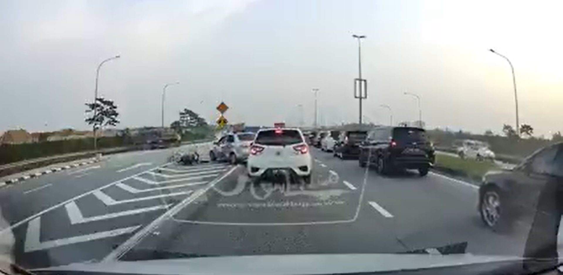 (八打灵再也19日讯)轿车突然在分叉道转换车道,随后而来的摩托车在没意识到的情况下,闪避不及直接撞上轿车,结果造成摩托车翻倒在地上。