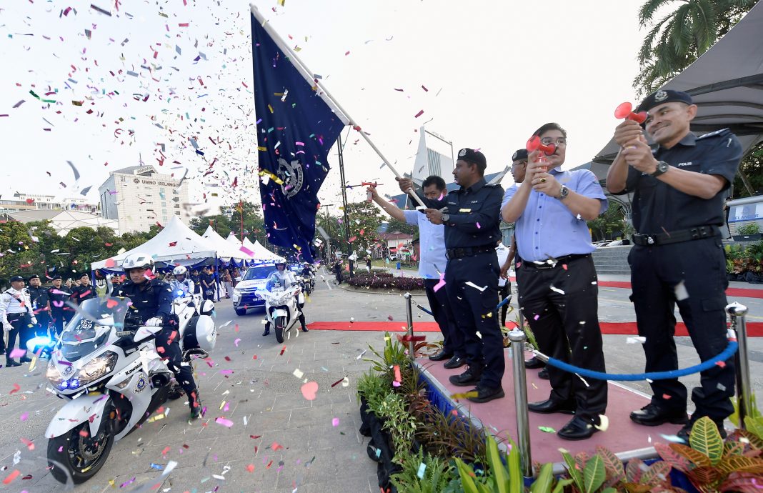 雪州总警长拿督胡申(右三)为雪州道路安全运动启动仪式主持挥旗礼。(马新社图)