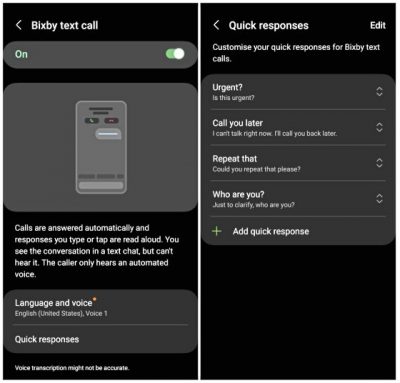 在这项功能里面,用户还可以设置“迅速回复”的词组(Quick responses),像是“Call you later”、“Repeat that”、“Who are you”或输入自己想要的回复词组。放心,这些词组只是一个“shortcut”,其背后是有完整的句子。比方说点击“Call you later”,Bixby会很有礼貌地代你跟对方说“I can’t talk right now. I’ll call you back later.”
