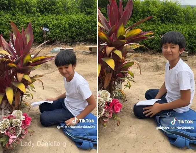 女子在TikTok平台PO出影片,她看到一个独自在坟墓前的男童,于是上前关心,结果得知对方的妈妈在6个月前去世,因为学校离这里很近,他每天都会来,有时会在坟前写作业。