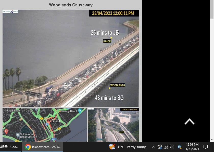 12:00pm 在新柔长堤,前往新加坡兀兰关卡方向出现车龙,预计需耗时48分钟才能通关。
