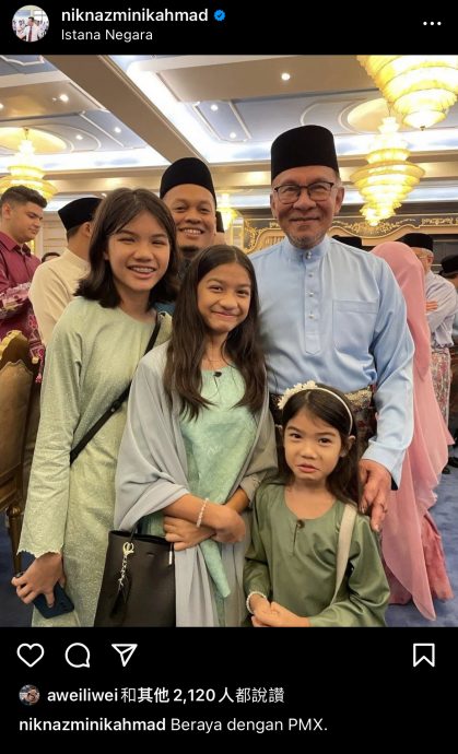 聂纳兹米昨日在社媒平台Instagram上载一张自己和女儿与首相拿督斯里安华的合照,并写道:“与第十任首相庆祝。”