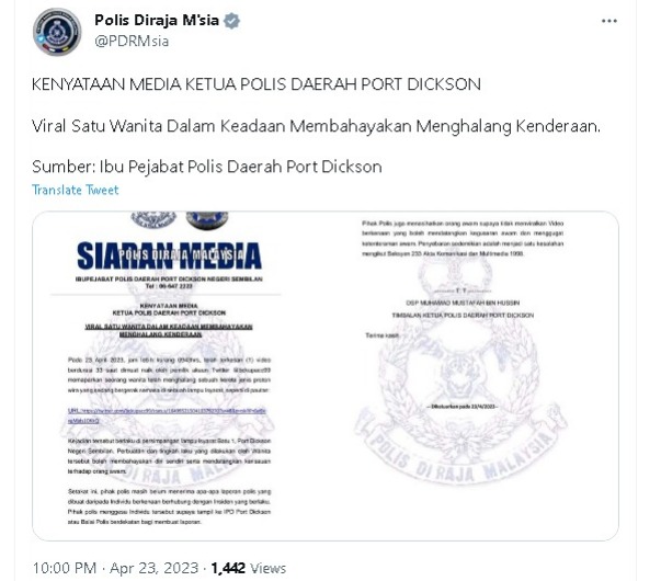 波德森警区总部莫哈末慕斯达法副警监昨日发文告指出,推特账户@bckupacc99发布有关一名妇女人肉挡车视频的事件,发生在波德森峇都1交通灯的路口。