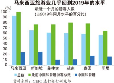 报告进一步指出,不包括来自中国和香港的游客,来自东盟6国(不包括马来西亚)的游客人数已恢复至2019年的75%水平。