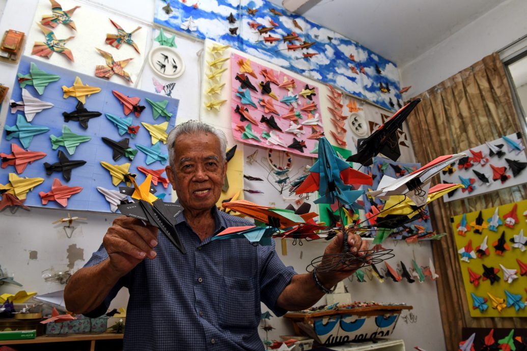 (槟城27日讯)今年88岁的退休老师余祖德,一双巧手把一张张的A4型纸张,折成各种形状的战斗机,精巧的技艺叫人赞叹。
