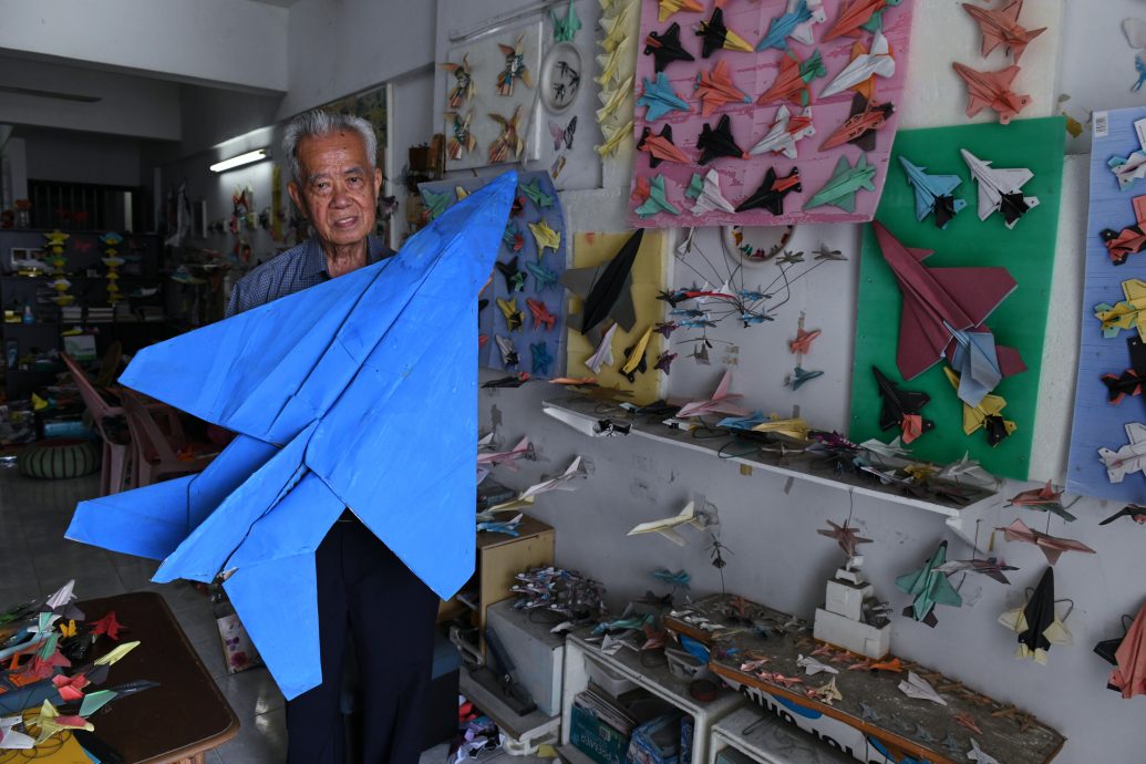 他也在槟岛武吉占姆开设“现代折纸艺术研究室”,里边摆放著大大小小600种战斗机纸折品。