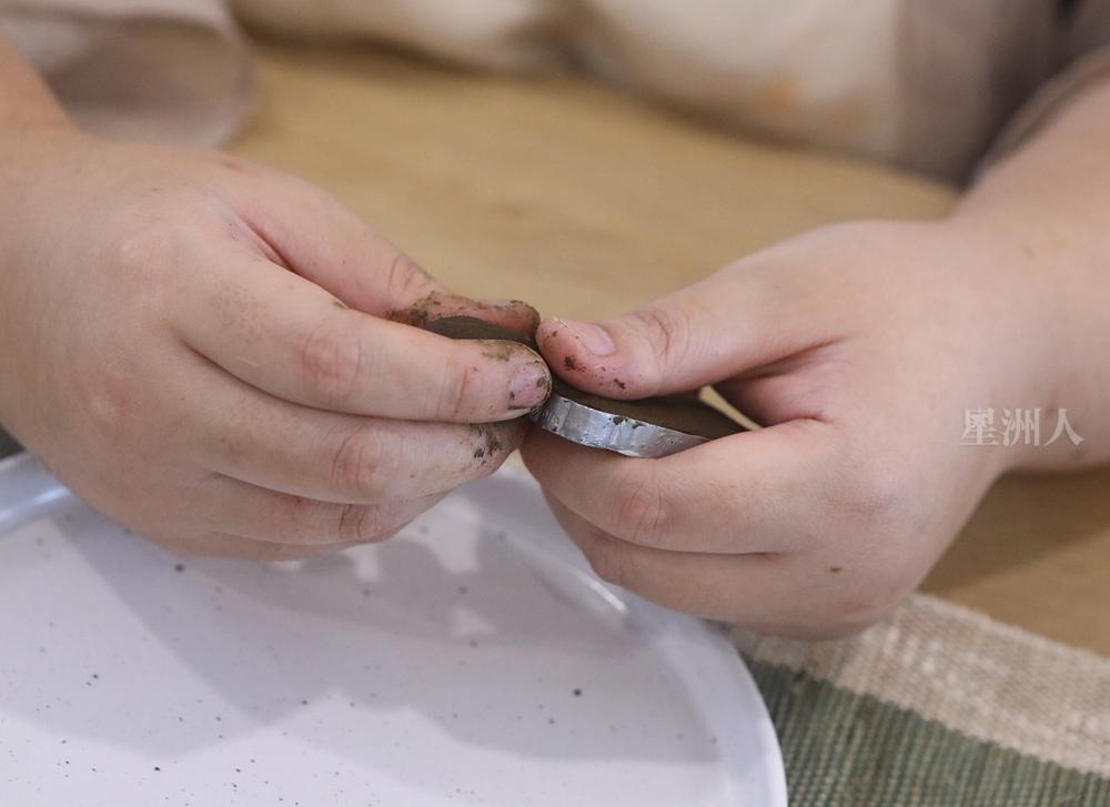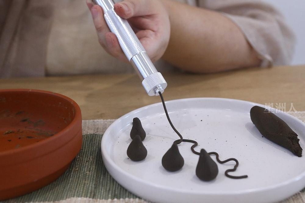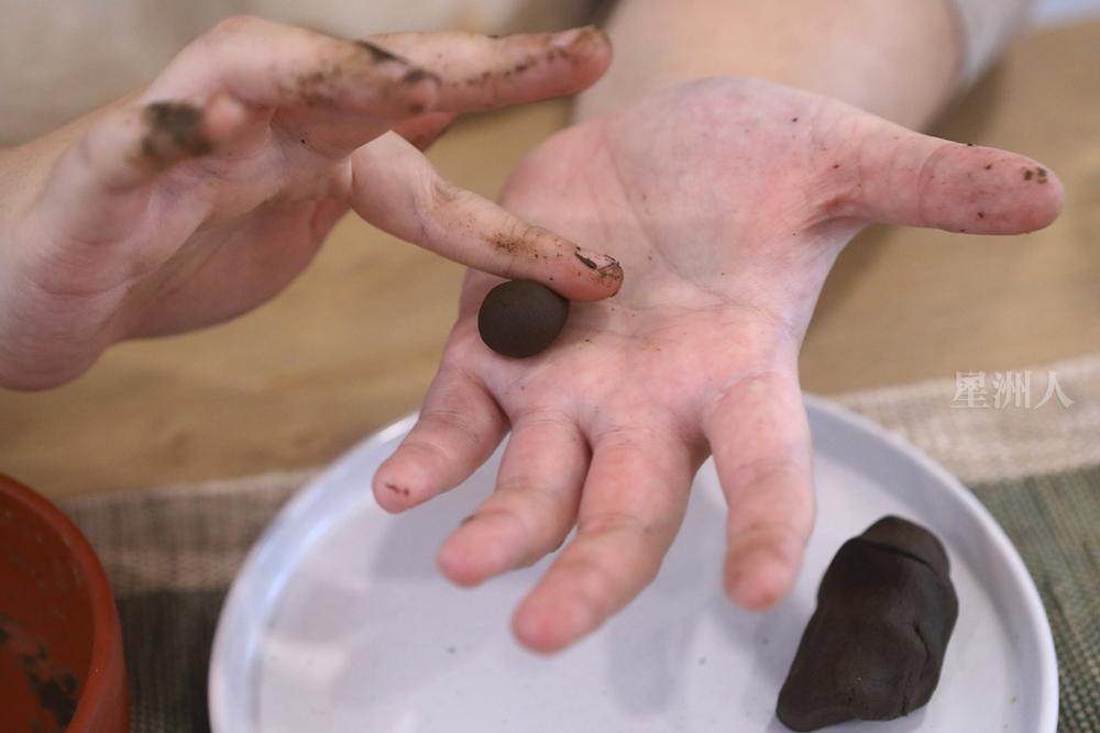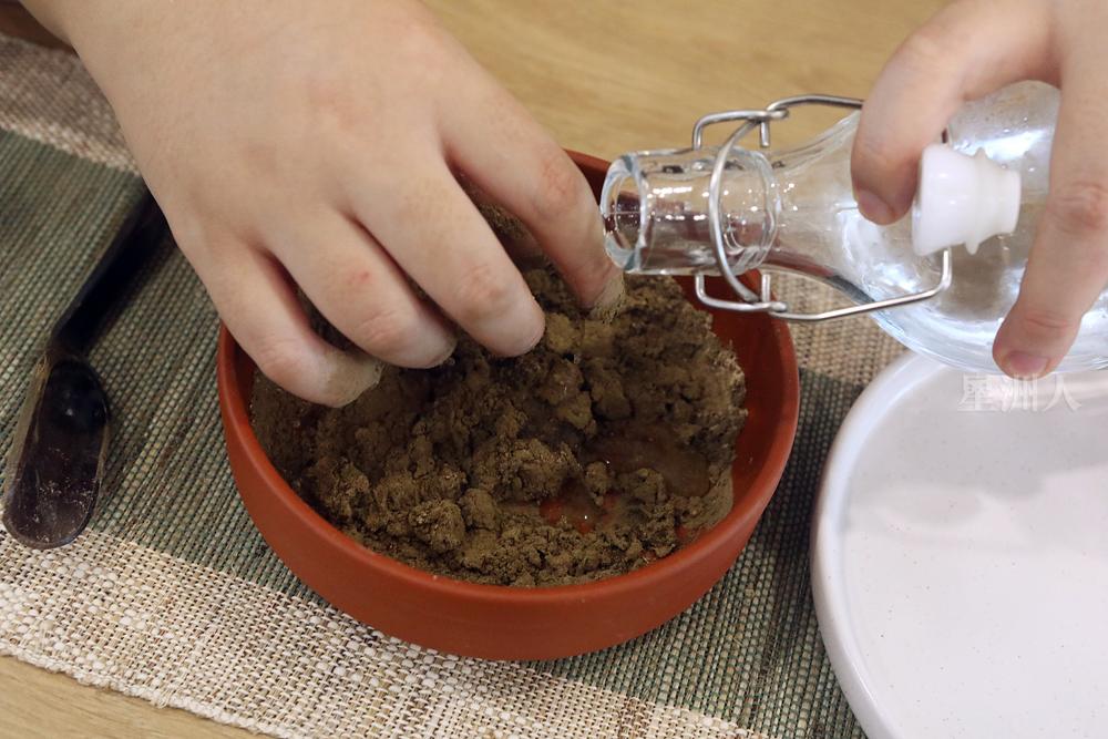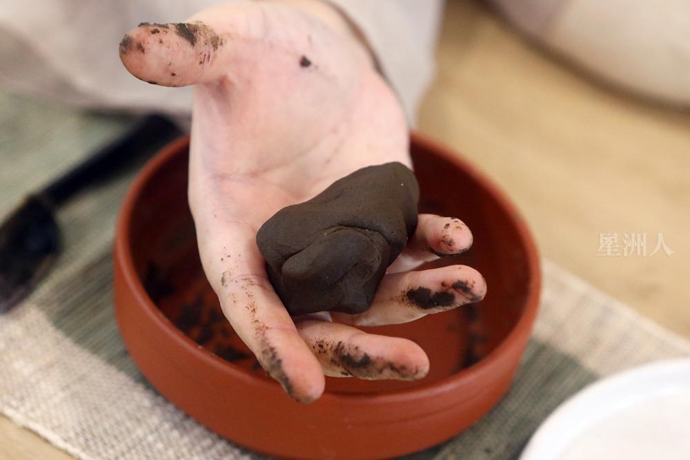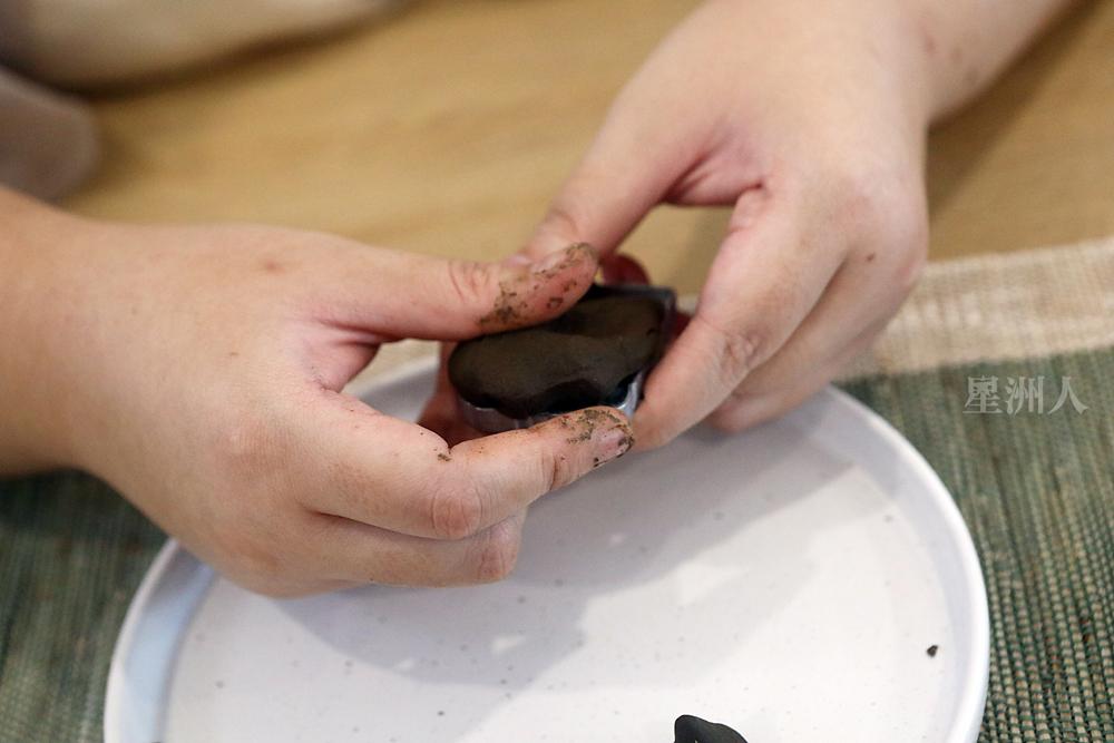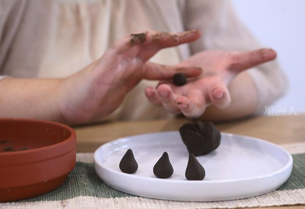 “心不能太急,一下子加太多水的话,随着搓揉水分会分泌出来。原则是成型和不粘手,搓至微弹性,不需要很久,但要不停地搓揉。” 她边搓揉香泥边解说,不一会儿,香泥就成型,手指按压下,质地轻柔如纸黏土,此时便可造型。