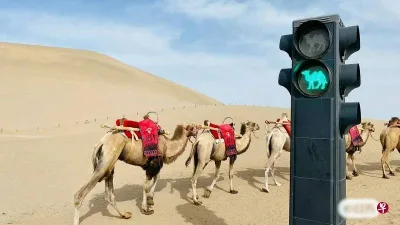 敦煌鸣沙山景区 “骆驼交通灯”维持交通秩序