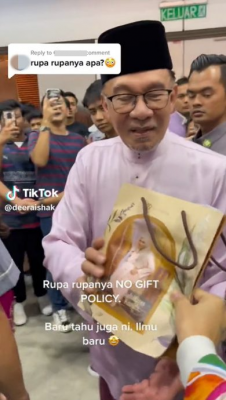 根据视频,首相安华很亲切地接过女子递上的礼品袋,而就在那一刻,首相高级政治秘书拿督斯里阿末法罕立即冲了上来,向女子支付了100令吉,表示是首相购买了礼品袋。