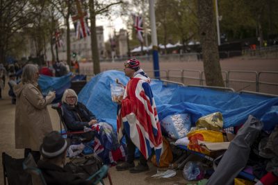 为准备英国隔别70年来的首个英王的加冕典礼,通往白金汉宫的林荫路已被禁止通行 。但已有有少王室迷在白金汉宫外搭起帐篷抢头香。