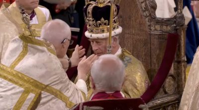 7.03pm:英王查尔斯在西敏寺由坎特伯雷大主韦尔比加冕。 韦尔比说:“万王之王,万主之主,我们祈求您保佑这顶王冠,使您的仆人查尔成圣,今天您将它戴在他的头上,作为王室威严的标志,以便他可以得到您的恩宠加冕, 充满丰盛的恩典和一切高贵的美德; 借着那活着并统治万物的至高者,独一的上帝,世界没有尽头。 阿门。”