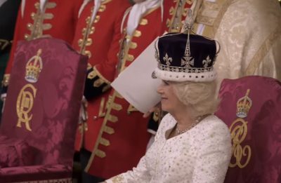 7.38pm:王后在公开场合受膏是对传统的一种突破。西敏寺住持将油从安瓿中倒入加冕礼的勺子中,并为坎特伯雷大主教拿着勺子。当女王被涂抹时,大主教说:“你的头要用圣油涂抹。全能的上帝,一切善的源泉;今天请听我们为你的仆人卡米拉的祈祷,我们以你的名义,以所有的虔诚,将她献给我们的女王。使她在信仰和爱中坚强,在各方面保护她,并在真理和和平中引导她;通过我们的主耶稣基督。阿门。”