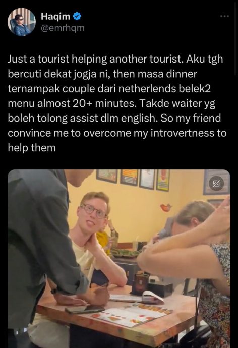 (八打灵再也7日讯)在家靠父母,出外靠朋友。一名大马男子到印尼日惹度假时,遇见一对外国情侣无法与当地餐馆员工沟通,于是自告奋勇协助充当双方的翻译沟通,最后完成任务,让他发挥大马人的热情精神之余,也为自己的“鸡婆”行为感到自豪。