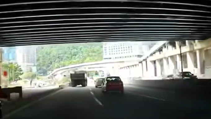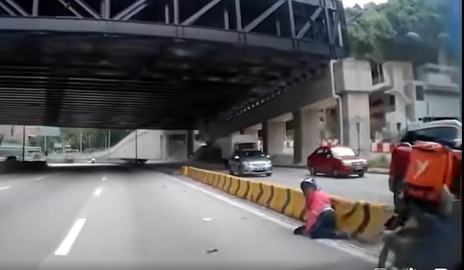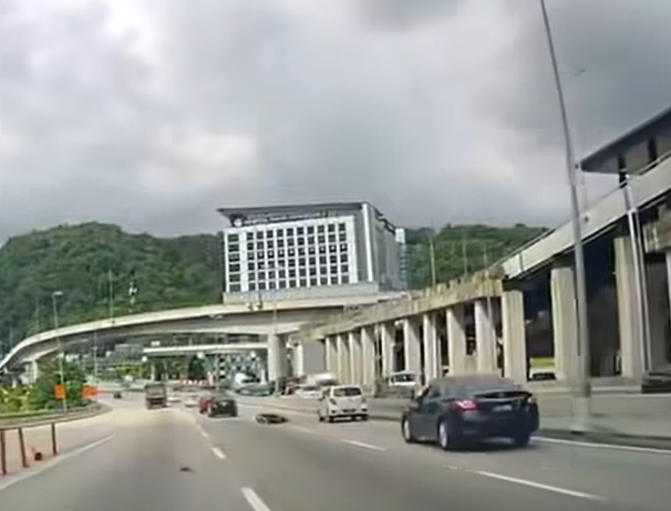 (八打灵再也7日讯)一辆罗里在高速大道鲁莽驾驶撞倒一名摩托车骑士,过程遭行车记录仪拍下视频及上载至社交媒体,惊险画面令网民直呼是“杀人罗里”!